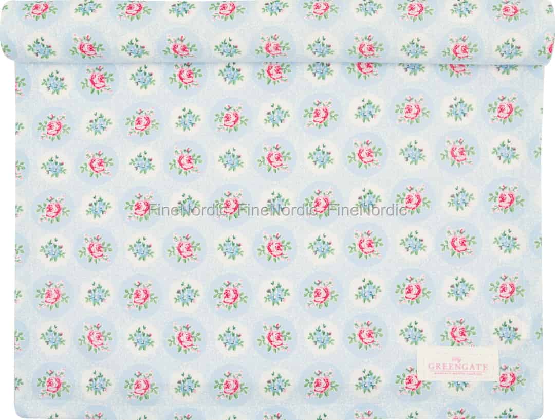 Elle Pale Blue-kolleksjonen fra GreenGate er et kjærlighetsbrev til den stille skjønnheten i en skandinavisk landlig hage. Denne nydelige bordløperen er hjertet i fortellingen, med sitt rolige, lyseblå lerret prydet med sjarmerende blomstermedaljonger. Hver lille bukett av rosa roser og delikate blå blomster er innrammet i en sirkel, forbundet med et intrikat blondelignende mønster som hvisker om arvestykker og kjære tradisjoner. Det er et design som føles både friskt og velkjent, og som inviterer deg til å senke tempoet og sette pris på de små, vakre detaljene.