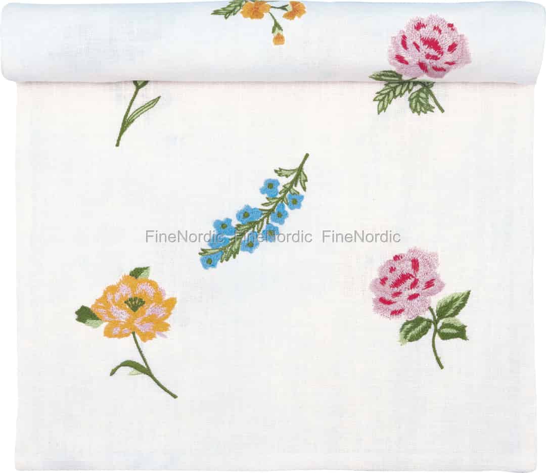 Se for deg en mild sommerbris som bærer med seg duften av en blomstrende hage. Bordløperen Estrid White fanger dette idylliske øyeblikket og strør delikate, fargerike villblomster over bordet ditt i vakkert broderi. Det er et snev av landlig sjarm for dine sammenkomster.