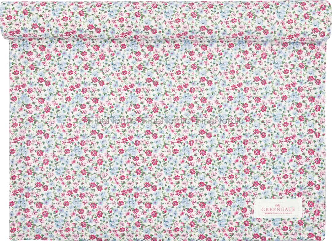 Louisa White-kolleksjonen fra GreenGate er en hyllest til de enkle gleder og naturens tidløse skjønnhet. Stoffet er som et lerret for en sjarmerende eng av små blomster i glade rosatoner og milde blåfarger, fremhevet av delikate grønne blader. Dette intrikate mønsteret vekker følelsen av et klassisk skandinavisk sommerhus, hvor vinduene står på vidt gap for å slippe inn den søte duften fra hagen. Den rene bomullskvaliteten føles herlig autentisk å ta på, og lover kvalitet for utallige sammenkomster i tiden som kommer.
