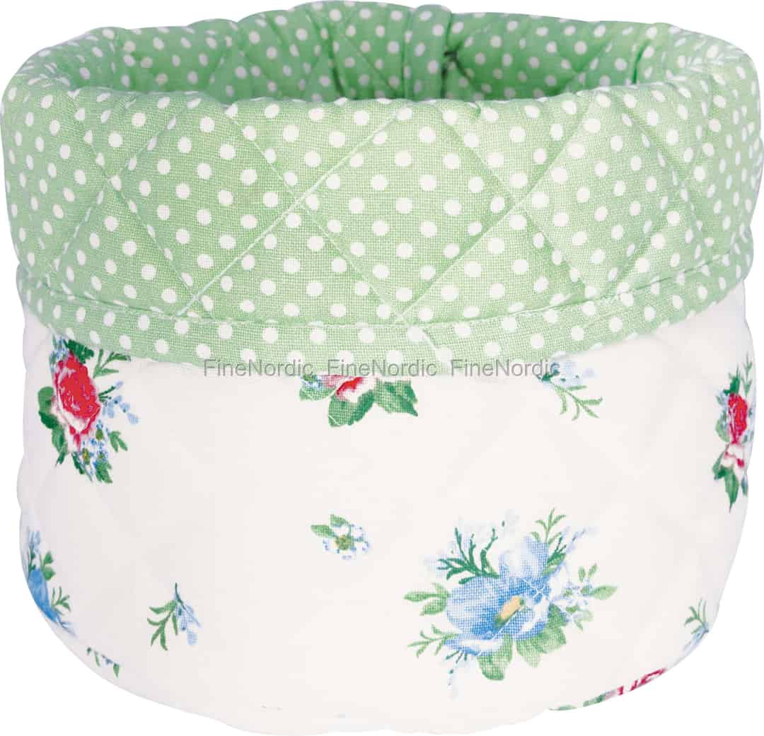 GreenGate har en vidunderlig evne til å fange essensen av dyrebare øyeblikk, og brødkurven Alivia White er et perfekt eksempel. Designet føles som en side fra en kjær eventyrbok, med delikate røde og blå blomster spredt over et friskt, hvitt bomullslerret. Dette tidløse blomstermønsteret komplementeres vakkert av det friske, mintgrønne polkadot-interiøret, som avsløres i den sjarmerende, nedbrettede kanten. Dette er en gjenstand som ikke bare holder brød; den rommer løftet om varme, felles sammenkomster.