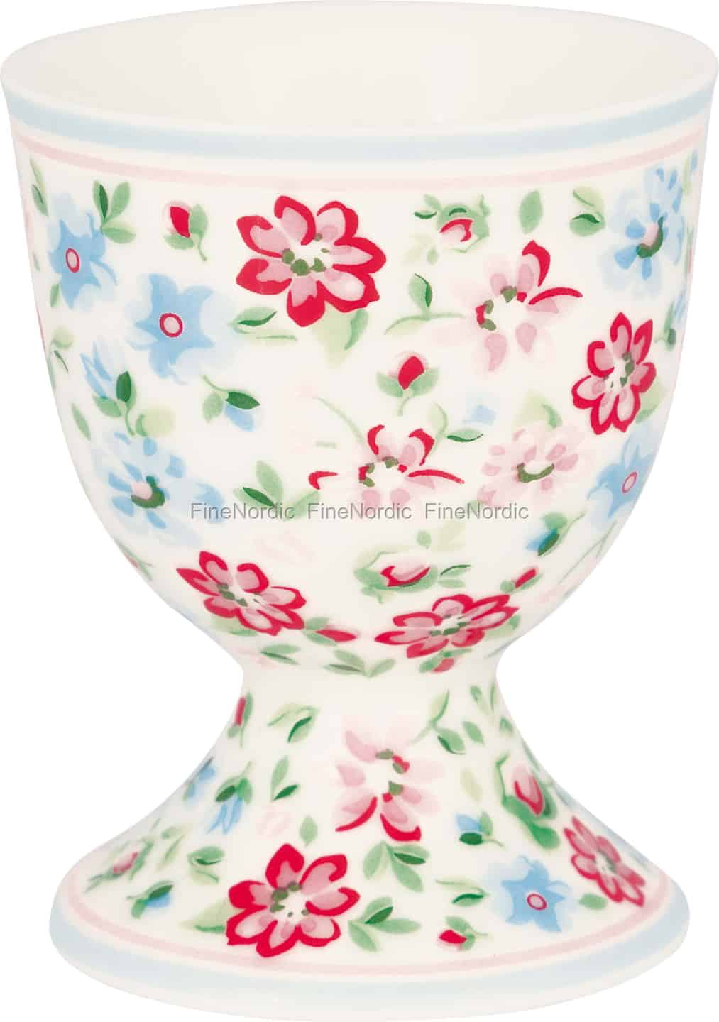 La den milde sjarmen fra Louisa White-kolleksjonen lyse opp morgenene dine. Inspirert av den stille skjønnheten i en blomstrende hage, forvandler dette utsøkte eggeglasset fra GreenGate en enkel frokost til et kjært ritual. Hver blomsterdetalj, fra de livlige røde blomstene til de myke blå forglemmegeiene, er spredt over den glatte keramiske overflaten og skaper et fargerikt vev som føles både friskt og nostalgisk. De delikate stripene i lyserosa og lyseblått langs kanten og foten gir en perfekt, gjennomtenkt avslutning.