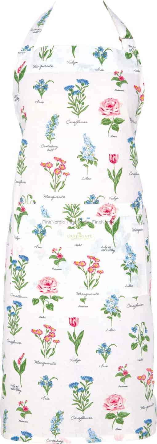 Se for deg en rolig spasertur gjennom en blomstrende hage, med skisseboken i hånden, for å fange de delikate formene til hver blomst. Agnes White-forkleet fra GreenGate fanger denne følelsen på en nydelig måte. Hver blomst, fra den ydmyke kornblomsten til den romantiske rosen, er gjengitt med kunstnerisk detaljrikdom og merket med elegant skrift, noe som skaper et vev av botanisk undring på ren, myk bomull. Det er et design som hyller den enkle, stille skjønnheten i naturen.