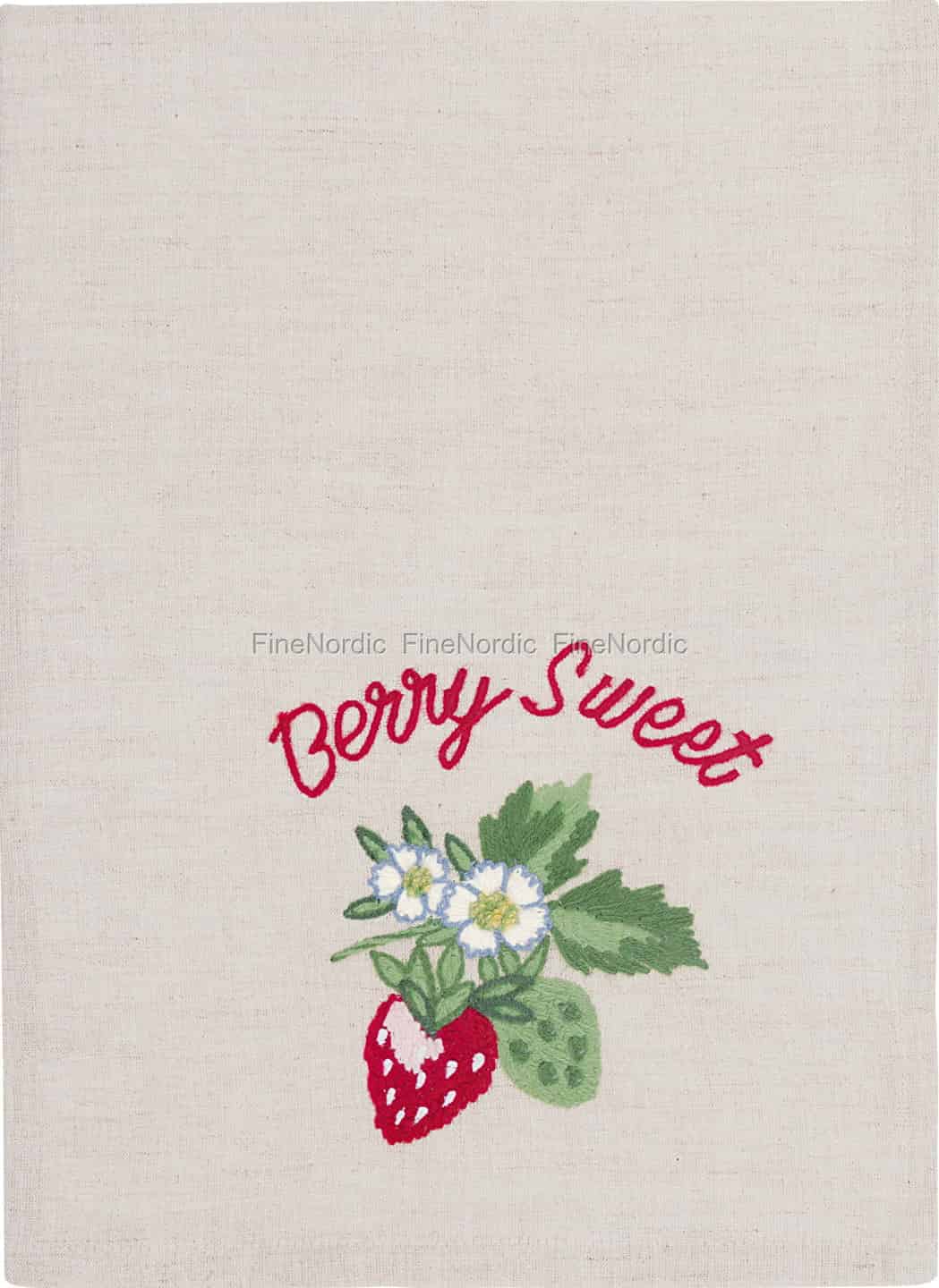 - Utsøkt, håndlaget detalj: Det vakkert detaljerte jordbærbroderiet, med sine livlige farger og teksten "Berry Sweet", gir et lekent og nostalgisk preg til kjøkkeninnredningen din.