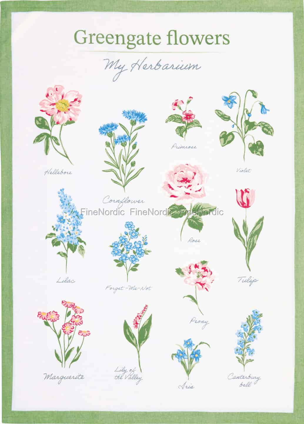 Forestill deg en mild bris som bærer med seg duften av en blomstrende hage gjennom kjøkkenvinduet. Dette nydelige kjøkkenhåndkleet fra GreenGate fanger nettopp denne følelsen, og forvandler en hverdagslig gjenstand til et lite stykke botanisk kunst for hjemmet ditt.