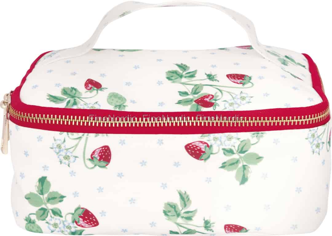 GreenGates "Berry White"-kolleksjon fanger essensen av en perfekt sommerdag, og denne sjarmerende kjølevesken er intet unntak. Det herlige mønsteret av modne jordbær, spede blomster og friske grønne blader er spredt utover et kremhvitt voksduklerret, og vekker den enkle gleden av å vandre gjennom en solfylt hage. Det er et design som føles både nostalgisk og vidunderlig friskt, og som forvandler en enkel lunsjveske til et vakkert tilbehør du vil elske å bruke. Den dristige røde glidelåsen med sine gylne messingtenner gir en siste munter kontrast, og lover at noe herlig skjuler seg på innsiden.