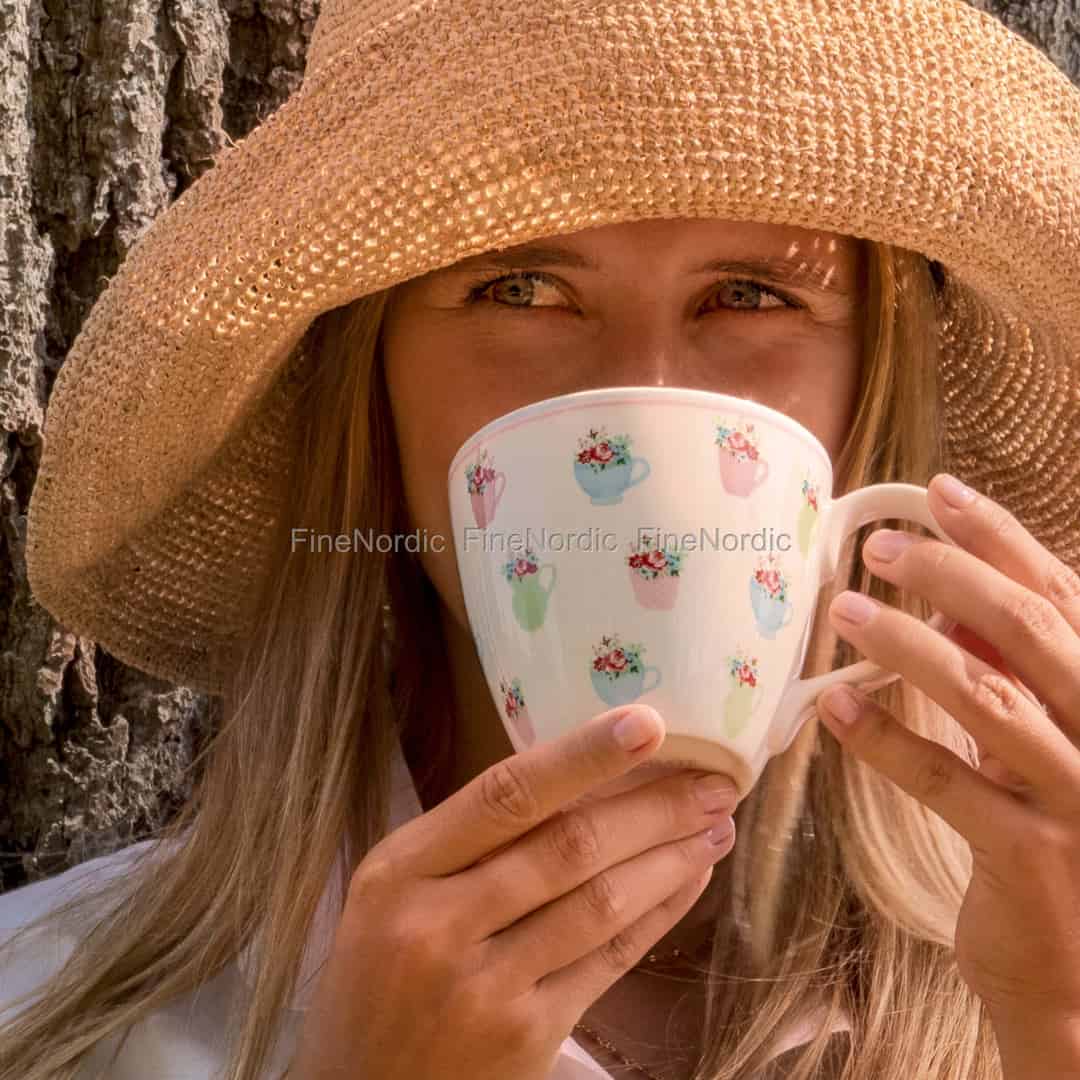 Annalise White-kolleksjonen fra GreenGate er et kjærlighetsbrev til de enkle gledene i en landlig hage. Hver lille illustrasjon – en pastellblå tekopp, en prikkete rosa mugge – er fylt med en miniatyrbukett av roser som vekker følelsen av et verdsatt ettermiddagsselskap. De delikate rosa og blå stripene langs kanten er en gjennomtenkt detalj som rammer inn designet med klassisk eleganse. Dette er ikke bare et krus; det er en liten beholder av lykke, skapt for å gjøre dine daglige ritualer litt mer spesielle.