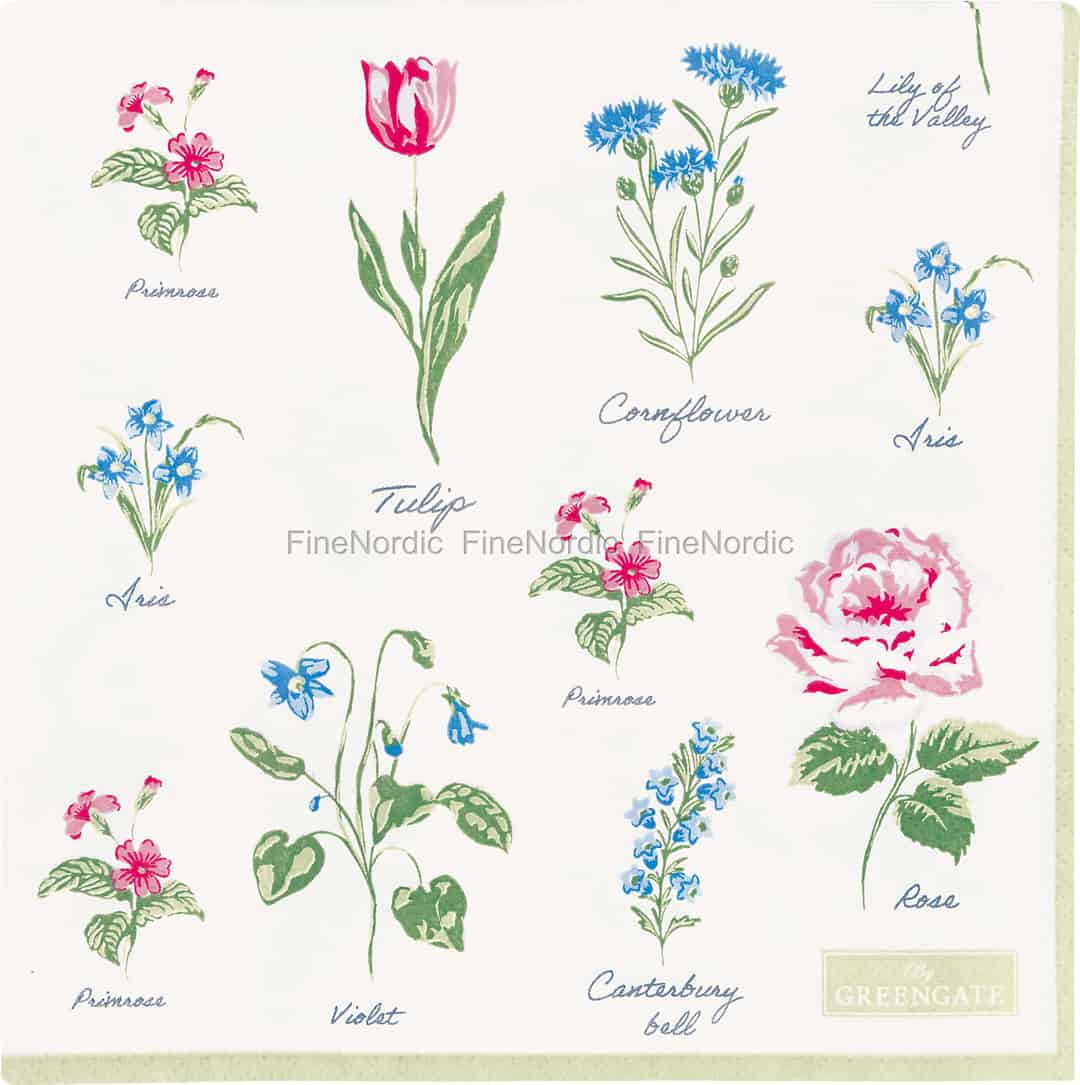 Agnes White-kolleksjonen er en kjærlighetserklæring til den enkle, beskjedne skjønnheten i en skandinavisk, landlig hage. Hver serviett brettes ut som en side fra en gammel botanisk skissebok, der delikate primulaer, livlige kornblomster og klassiske roser er gjengitt med kunstnerisk omhu. Det myke, offwhite papiret er det perfekte lerretet for disse fargerike blomstene, mens den elegante løkkeskriften som navngir hver blomst, tilfører et lag av nostalgisk sjarm. Det er en invitasjon til å senke tempoet og verdsette de små, vakre detaljene naturen har å by på.