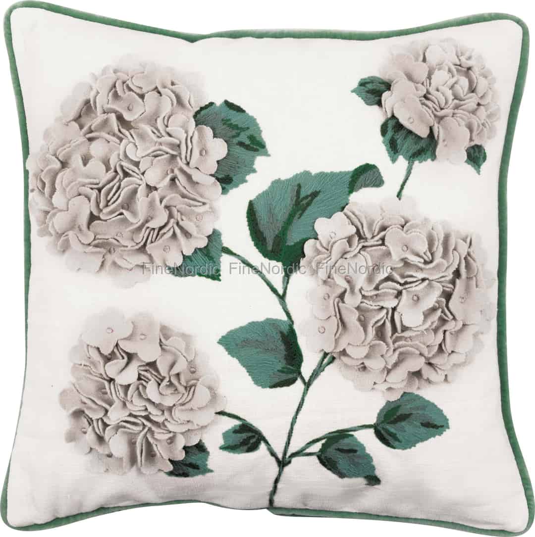 Putetrekket Liliana White er en hyllest til klassisk blomsterskjønnhet, designet av GreenGate for å bringe en følelse av fred og kunstnerisk eleganse inn i hjemmet ditt. På et lerret av ren, hvit bomull blomstrer intrikate hortensiaer i myke, dempede toner. Hvert kronblad er individuelt laget av myk applikasjon, noe som skaper en bemerkelsesverdig tredimensjonal effekt som du bare må strekke deg ut for å berøre. Det delikate broderiet av blader og stilker i en dyp grønnfarge forsterker dybdefølelsen og fanger den stille elegansen fra en elsket hage.