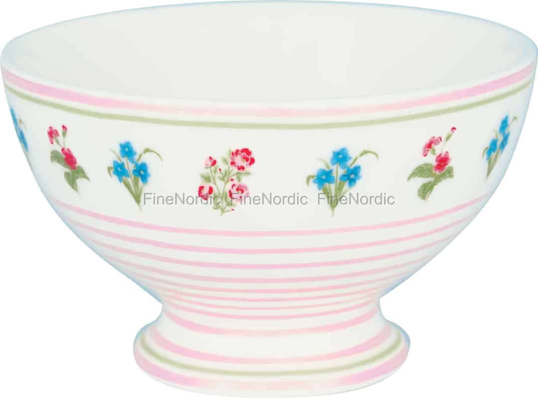 GreenGates Liana White-kolleksjon er et kjærlighetsbrev til den enkle skjønnheten i en dansk sommerhage. Denne sjarmerende snackskålen kombinerer to klassiske mønstre: søte, pastellfargede striper som vekker minner om ferier ved sjøen, og et delikat bånd av markblomster i milde nyanser av rosa, blått og salviegrønt. Den elegante silhuetten med fot gir den en raffinert karakter, og forvandler selv den enkleste snacksen til en spesiell anledning. Den er herlig å holde i, med sin glatte og behagelige, blanke keramikk.