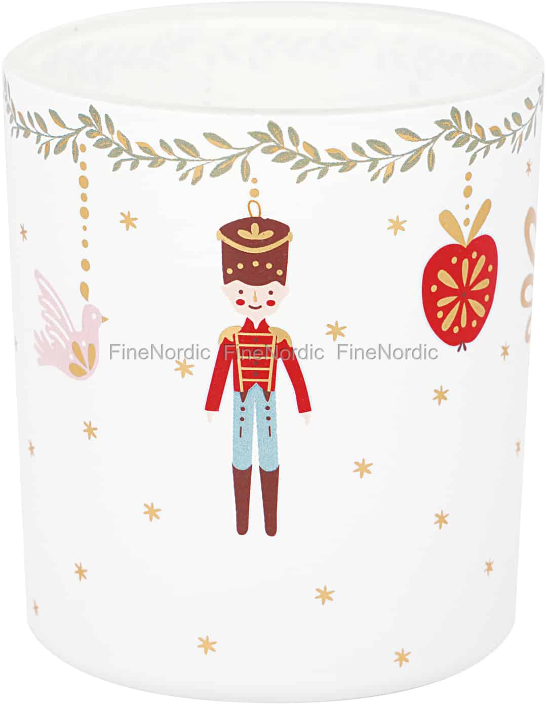 - Et lerret for julefortellinger: Det frostede glasset er prydet med sjarmerende, eventyrlige illustrasjoner av tinnsoldater og julepynt, som skaper en herlig fortelling som utfolder seg rundt holderen.