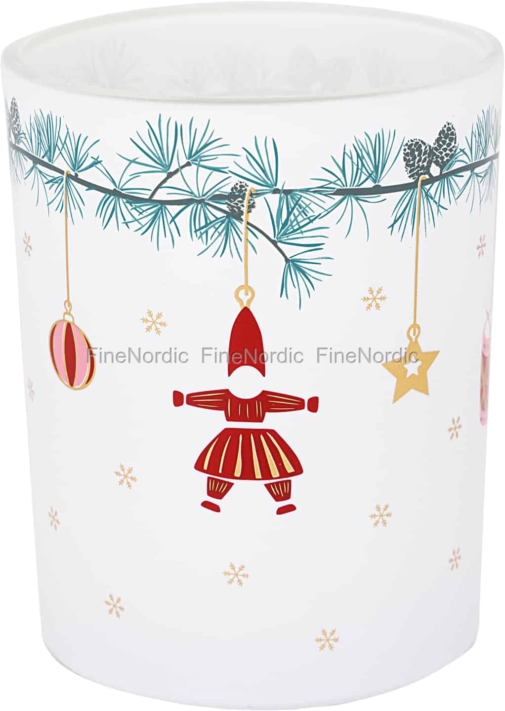 Oppdag den stille magien i en skandinavisk vinter med telysholderen Juana White fra GreenGate. Hver detalj i det omsluttende designet forteller en festlig historie, fra den glade, røde nissen som dingler fra en furugren, til de delikate gullsnøfnuggene som ser ut til å dale over det frostede glasset. Dette er et produkt som fanger essensen av en tradisjonell nordisk jul, og feirer naturen, folkeeventyrene og den enkle gleden ved lys.