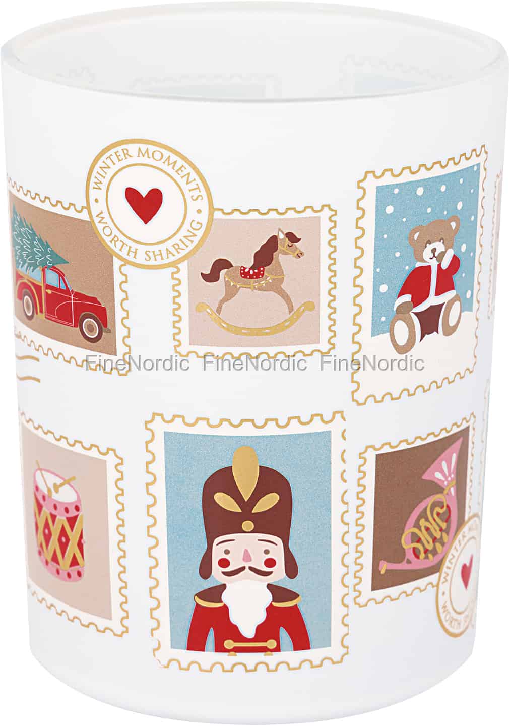 Husker du magien ved å motta julepost? GreenGates Xmas Letter-kolleksjon fanger denne hjertevarme nostalgien. Denne nydelige telysholderen er som en samling kjære postkort fra tidligere julefeiringer, der hvert frimerke forteller en liten, gledelig historie. Den frostede glassoverflaten er et perfekt lerret for de detaljerte illustrasjonene av gyngehester og tinnsoldater, alt i en myk og tidløs fargepalett. Budskapet, 'Winter Moments Worth Sharing', er en mild påminnelse om hva høytiden virkelig handler om.