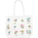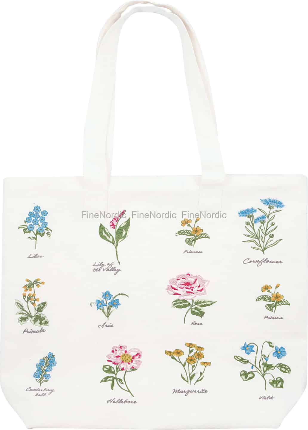 Inspirert av de delikate illustrasjonene i en gammel botanisk journal, er vesken Agnes White en hyllest til naturens stille skjønnhet. Hver blomst, fra den ydmyke fiolen til den livlige margeritten, er gjengitt i utsøkt broderi, komplett med navnet sitt i elegant skrift. Det er som om du har plukket en perfekt bukett fra en blomstrende eng og kan bære den med deg, sesong etter sesong. Det rene, hvite bomullslerretet danner det perfekte bakteppet, slik at de myke, levende fargene i trådene virkelig kommer til sin rett.