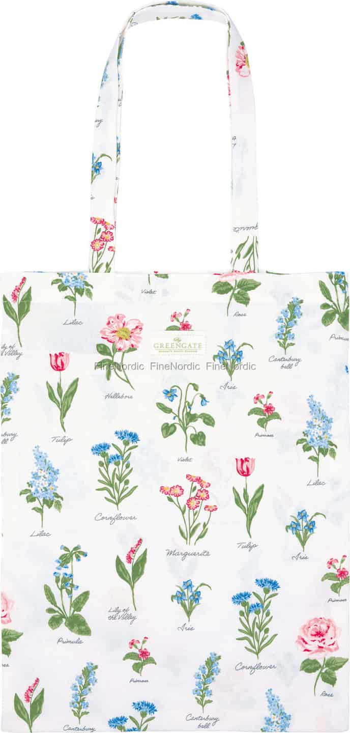 Med Agnes White-vesken inviterer GreenGate deg til å bære med deg et stykke av en skandinavisk hage. Den rene, hvite bomullen fungerer som et lerret for et herlig utvalg av botaniske illustrasjoner – fra den milde syrinen til den lystige kornblomsten, hver tegnet med kunstnerisk detaljrikdom. Dette er ikke bare en veske; det er en feiring av naturens enkle skjønnhet, designet for å tilføre litt glede og farge til dagen din, enten du besøker det lokale biblioteket eller henter ferskt brød fra bakeriet.