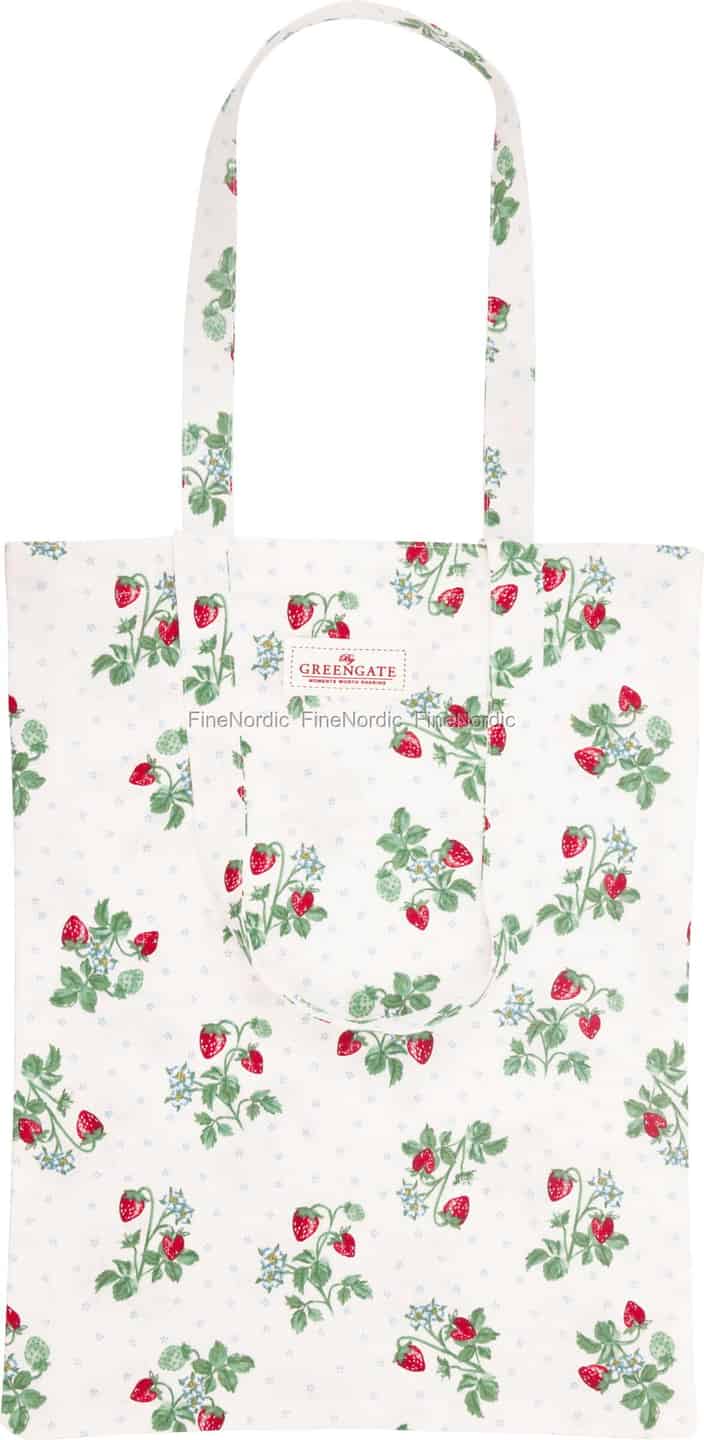 Se for deg en spasertur gjennom en solfylt hage, med kurven i hånden. Denne sjarmerende GreenGate-vesken fanger nettopp denne følelsen, med sitt herlige mønster av søte markjordbær og spede blomster på ren, hvit bomull.