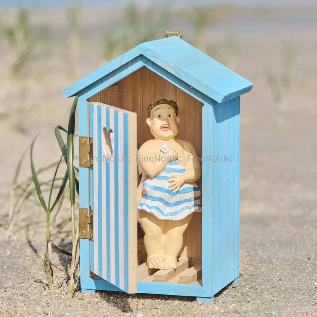 - Et snev av leken humor: Inne i det klassiske, blå badehuset tilfører en komisk herre et herlig snev av humor, noe som gjør figuren til en sjarmerende samtalestarter for gjester.