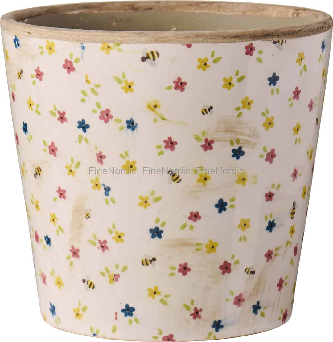 Fra det kjære danske merket Ib Laursen er 'Petit Fleur'-potten en hyllest til naturens enkle skjønnhet. Den kremfargede keramiske overflaten fungerer som det perfekte lerretet for en spredt eng av små blomster i myke røde, blå og solgule nyanser. Ser du nøye etter, vil du oppdage sjarmerende små humler som summer blant blomstene – en detalj som tilfører et lag av mild eventyrlighet. De bevisst rustikke flekkene og den uglaserte kanten gir den en autentisk, slitt karakter, som om den har vært en del av en elsket, landlig hage i årevis.