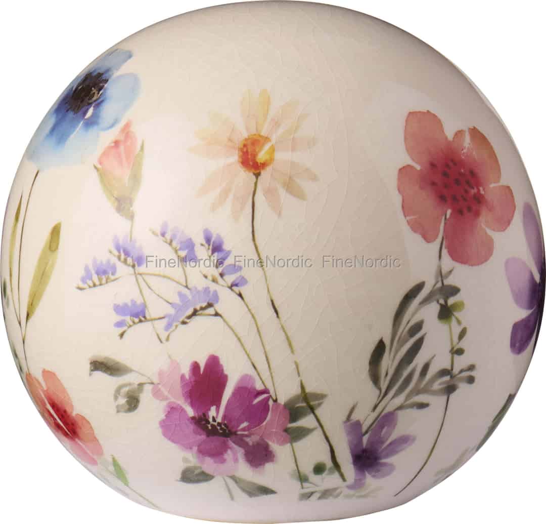 Inspirert av den ville, utemmede skjønnheten i den skandinaviske floraen, er denne dekorative kulen fra Ib Laursen et lite kunstverk for hjemmet ditt. Keramikkoverflaten fungerer som et lerret for et delikat utvalg av villblomster, malt med de myke, flytende fargene fra akvarellmaling. Valmuer, kornblomster og prestekrager blander seg i en myk dans, formene deres fanget med en lett, uttrykksfull hånd. Hele kulen er avsluttet med en fin krakelert glasur, som skaper et nett av subtile linjer som gir assosiasjoner til den milde patinaen til en verdsatt antikvitet.