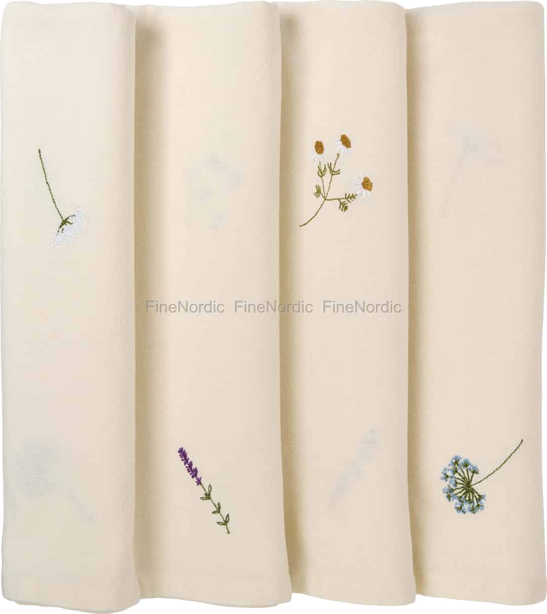 Ser du nærmere etter, vil du oppdage kjernen i dens sjarm: intrikat broderte villblomster. Delikate kvister av lavendel, lystige prestekrager og yndige skjermblomster er spredt utover stoffet, hver og en et lite kunstverk som fanger den utemmede skjønnheten fra en sommereng. Disse gjennomtenkte detaljene bringer et snev av naturens poesi inn i interiøret ditt, og gjør hvert måltid litt mer spesielt og knyttet til årstidene.
