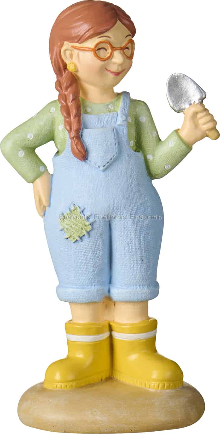 Fra Ib Laursen-kolleksjonen legemliggjør denne nydelige gartneren ånden av et liv i harmoni med naturen. Legg merke til de gjennomtenkte detaljene som gir henne så mye personlighet: den pene fletten i håret, den glade, prikkete skjorten og den lille, reparerte lappen på snekkerbuksene – et tegn på mange gledesfylte timer med jord under neglene. Hennes knallgule gummistøvler er klare for all slags vær, og den trofaste plantespade i hånden hennes tyder på at hun akkurat har tatt en pause for å beundre sitt verk.