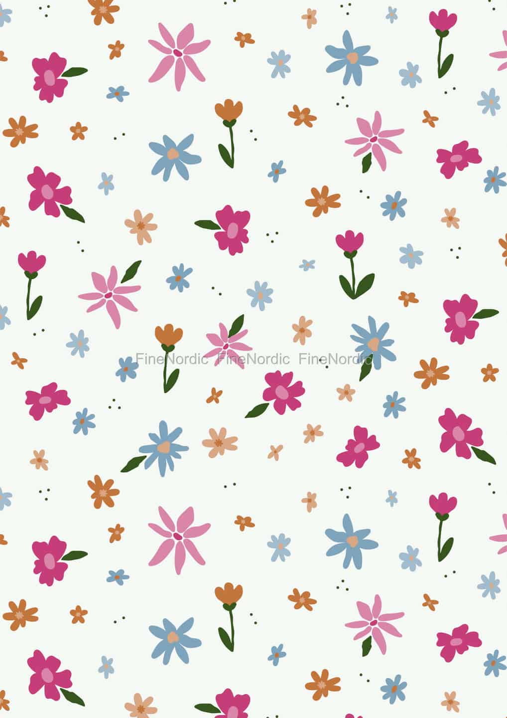 - Et muntert og finurlig design: En herlig eng av stiliserte blomster i magenta, blått og oker danser over en kremhvit bakgrunn, og gir et snev av finurlig skandinavisk sjarm til enhver anledning.