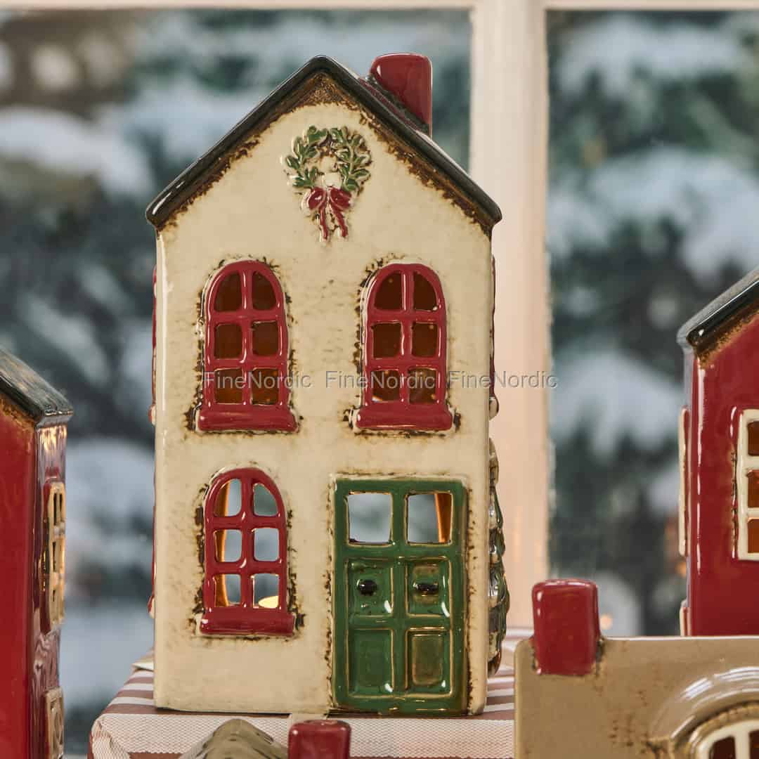 Se for deg en stille vinterkveld, med snø som daler mykt utenfor vinduet. Inne kaster dette sjarmerende keramikkhuset et varmt, flakkende lys og fyller rommet med den milde magien fra en skandinavisk jul.