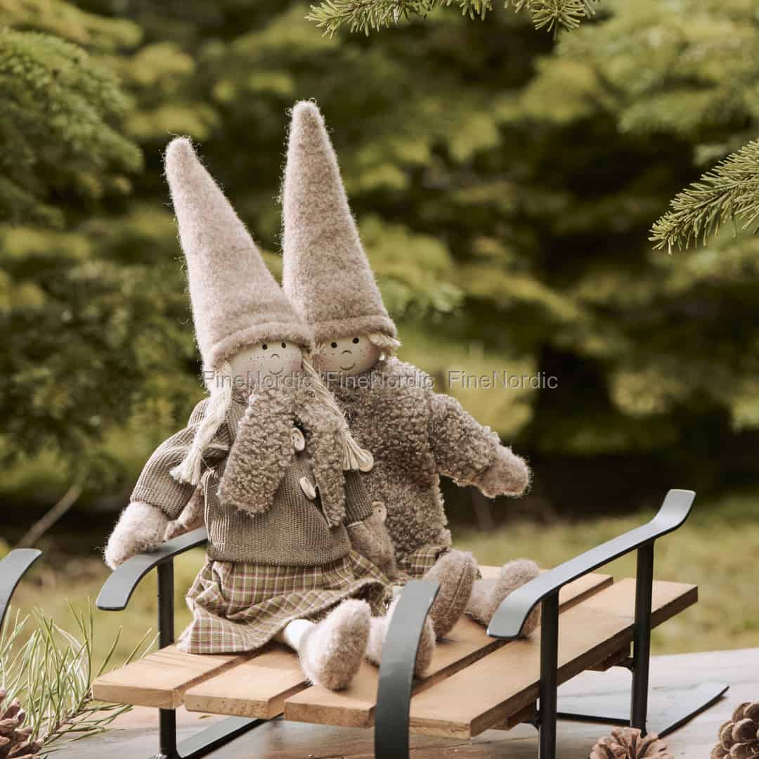 Fra Ib Laursens fortryllende kolleksjon 'My Nostalgic Christmas', ønsk velkommen til Klara og Kurt. Disse milde skikkelsene fanger den rene, rolige stemningen av en tradisjonell skandinavisk jul, som om de nettopp har tatt steget ut fra en koselig skogshytte. Hver detalj, fra deres søte, fregnete ansikter til de herlig teksturerte antrekkene, er skapt for å inspirere til varme og gode minner. Klara, med sitt fine rutete skjørt og fleeceskjerf, og Kurt, med sin matchende fleecejakke, er kledd for en frisk vinterdag blant furutrærne.