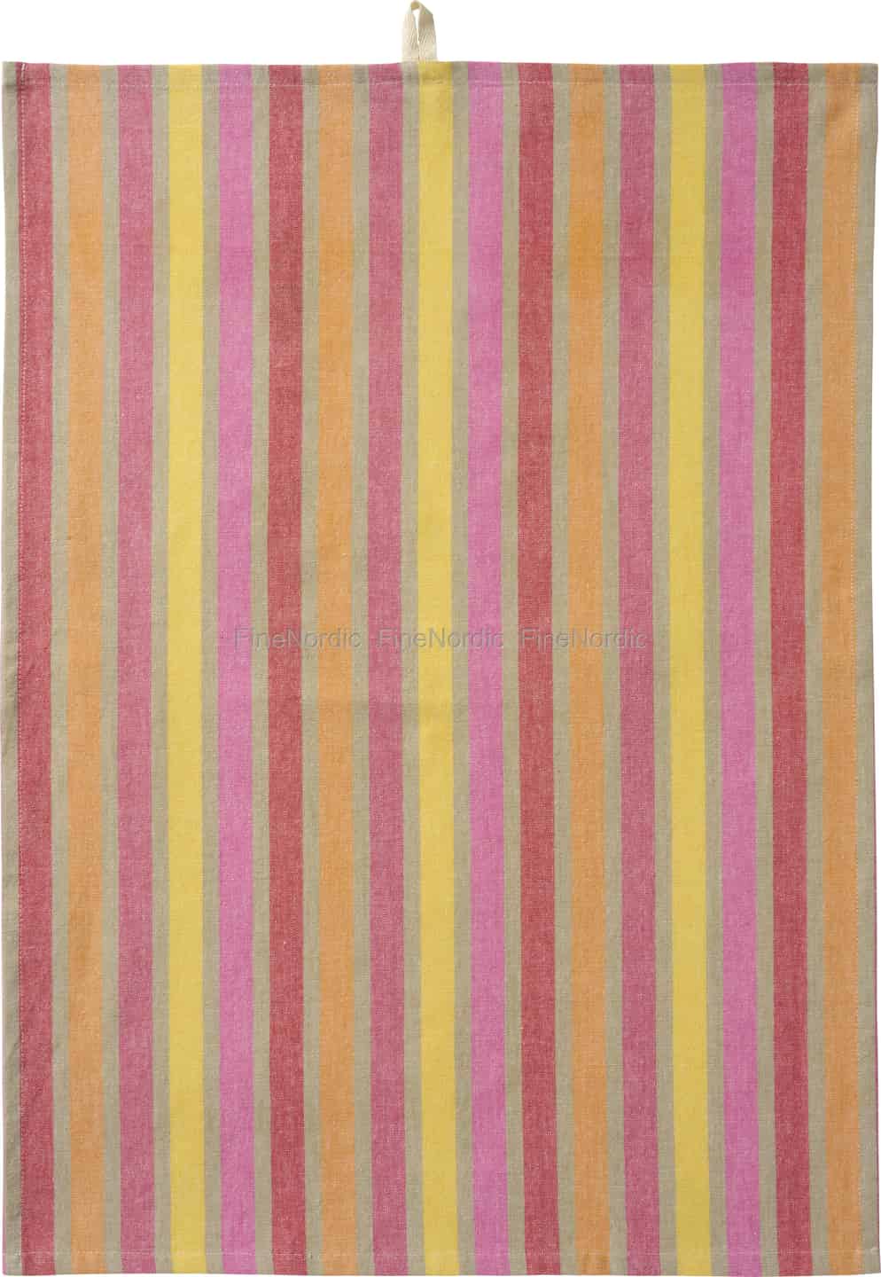 Hvert kjøkken forteller en historie, og med dette nydelige kjøkkenhåndkleet fra Ib Laursen kan du legge til et kapittel fylt med varme og farger. De herlige stripene – som minner om sommerhus ved sjøen og blomsterenger – er designet for å få frem smilet, enten du tørker favorittkoppen din eller legger det i brødkurven til en familielunsj. Fargepaletten med varme rosatoner, solgult og myke oransjetoner mot en naturlig beige bakgrunn, føles både livlig og beroligende.