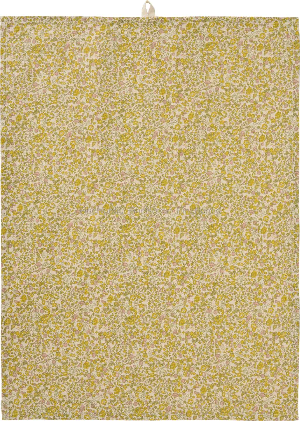 Rita-kjøkkenhåndkleet fra Ib Laursen er som et lite stykke solkysset blomstereng, fanget på myk, naturfarget bomull. Overflaten er dekket av et tett, småblomstret mønster der muntre gule og sart rosa blomster blander seg med delikate grønne blader. Dette sjarmerende designet vekker følelsen av den enkle gleden ved å plukke markblomster på en sommerdag, og bringer en atmosfære av varme og autentisk landstil til hjertet av hjemmet ditt. Det er et design som forteller en historie om å leve langsomt og finne skjønnhet i hverdagen.