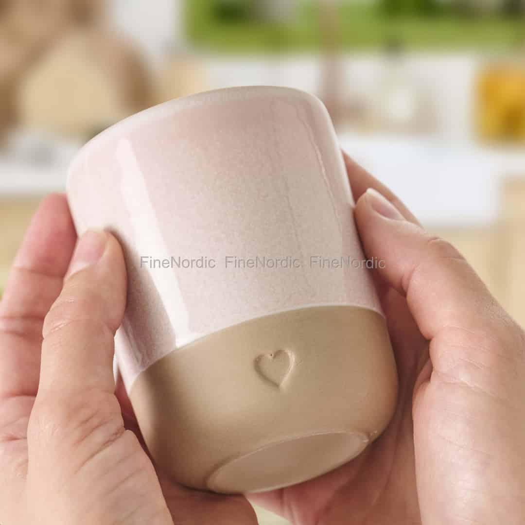 Dette kruset er for de dyrebare øyeblikkene av alenetid – den første kaffen om morgenen når solen står opp, eller en beroligende urtete før sengetid. Formen uten hank oppmuntrer deg til å omfavne det med hendene og hente trøst fra varmen. Det søte, pregede hjertet er en stille påminnelse om å finne glede i de små tingene. Et helt spesielt produkt som bringer et snev av ekte skandinavisk *hygge* inn i hjemmet ditt.