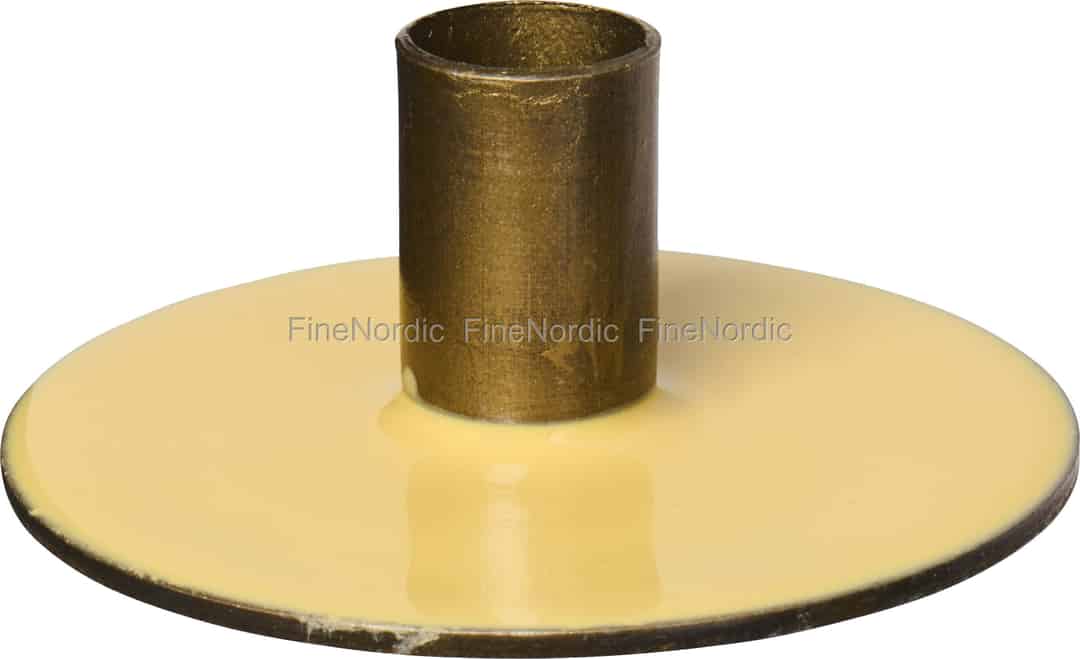 - Et muntert fargeinnslag: Den blanke, lysgule emaljefoten står i vakker kontrast til holderen i børstet messing, og tilfører et streif av diskré solskinn til peishyllen eller vinduskarmen din.
