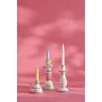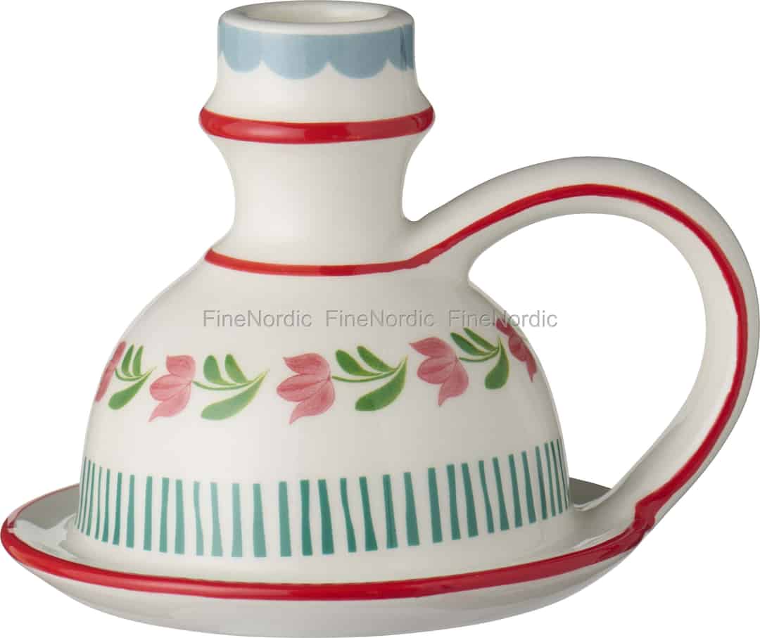 Inspirert av de glade mønstrene i skandinavisk folkekunst, er denne lysestaken fra Ib Laursen en liten feiring av farger og tradisjon. Hver detalj, fra de myke rosa blomstene og grønne stripene til de klare, blanke røde linjene, er designet for å lokke frem et smil. Den offwhite kermaikkbasen gir et varmt lerret, mens den klassiske kammerstakeformen – med sin praktiske hank og skål – minner om enklere tider, da en enkelt flamme var alt som skulle til for å få et rom til å føles som et hjem.