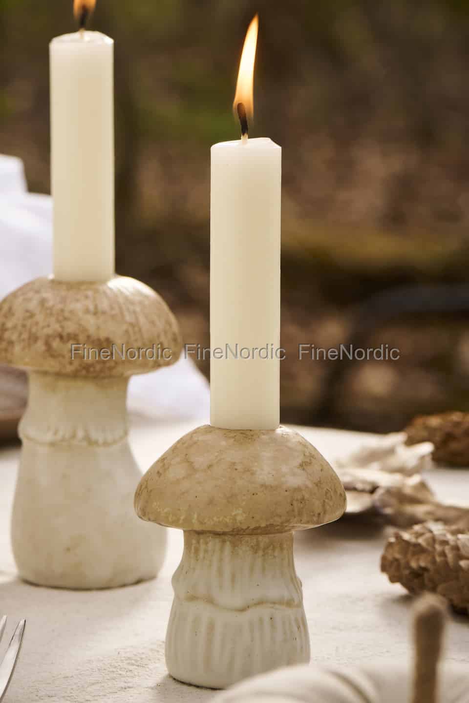 Se for deg en rolig spasertur gjennom en solfylt skog, der sjarmerende sopper titter frem fra mosegrodde tuer. Denne vakre keramikklysestaken fra Ib Laursen fanger nettopp denne essensen. Hver detalj, fra den jordfargede, spetteprikkede hatten til den delikate, rillede teksturen på den kremfargede stilken, er nøye utformet for å vekke en følelse av naturens under. Det er et lite, skulpturelt stykke som forteller en historie om de fredfulle og fortryllende nordiske skogene, og bringer den roen inn i hjemmet ditt.