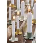 Se for deg disse små blomstene spredt utover spisebordet ditt, hver med en blafrende flamme som skaper en fortryllende atmosfære for en rolig middag. Eller forestill deg en trio i vinduskarmen, der det myke lyset deres hilser kvelden velkommen. På grunn av den nette størrelsen inviterer de deg til å leke med arrangementer, blande farger og skape din egen unike utstilling. Dette er ikke bare en lysestake; det er en invitasjon til å senke tempoet og verdsette de små, vakre øyeblikkene som gjør et hus til et hjem.