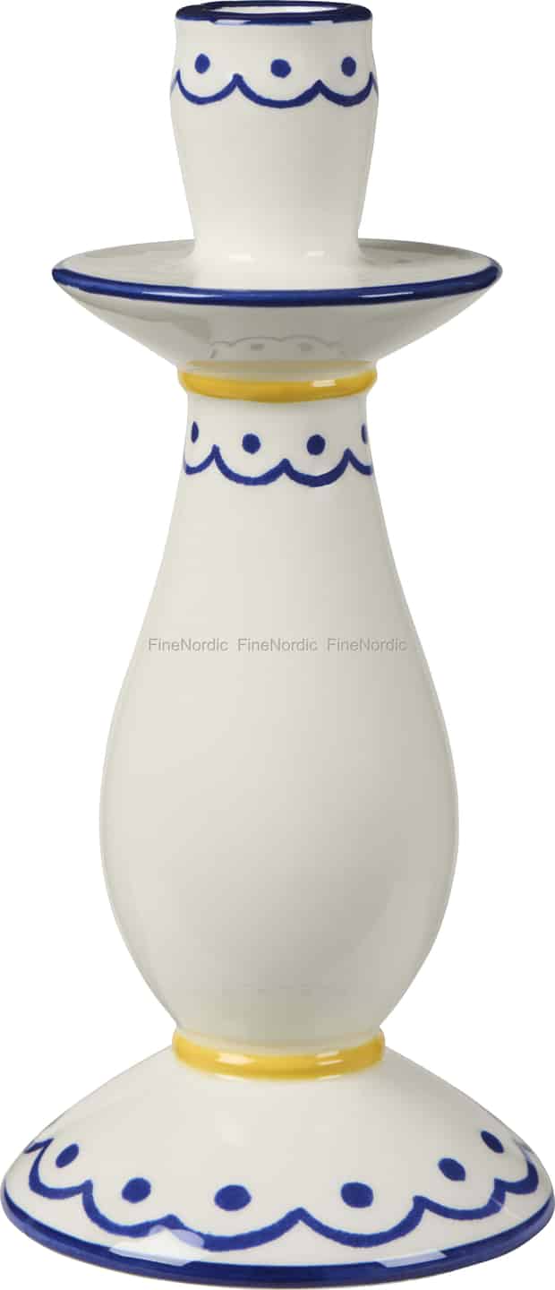 - Et unikt, håndlaget preg: Hver lysestake er prydet med sjarmerende, håndmalte blå bølgelinjer og solgule bånd. Dette sikrer at ingen er helt like, og gir innredningen din en autentisk karakter.