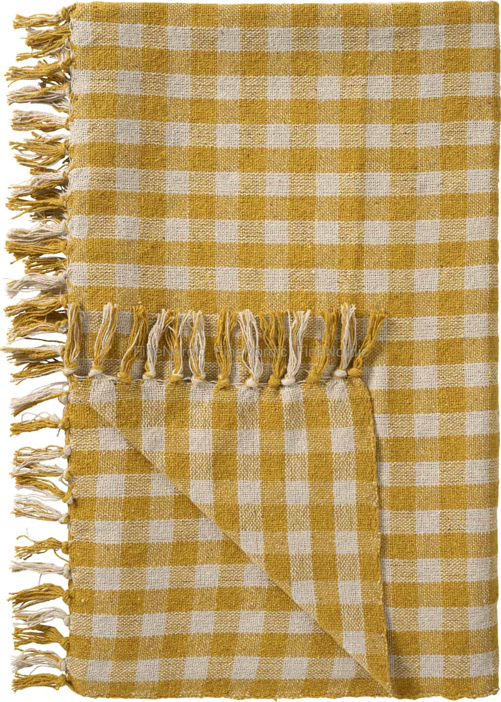 Se for deg en stille ettermiddag, med en mild bris som danser inn gjennom et åpent vindu. Dette vakre pleddet, med sine lystige gule ruter og myke bomullsfølelse, er den perfekte følgesvenn for fredfulle stunder med ren avkobling.