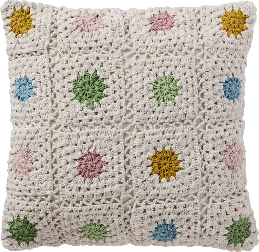Ib Laursen Putetrekk - Heklet - Krem - Flerfargede blomster, Bakside i kremfarget kanvas 50 x 50 cm