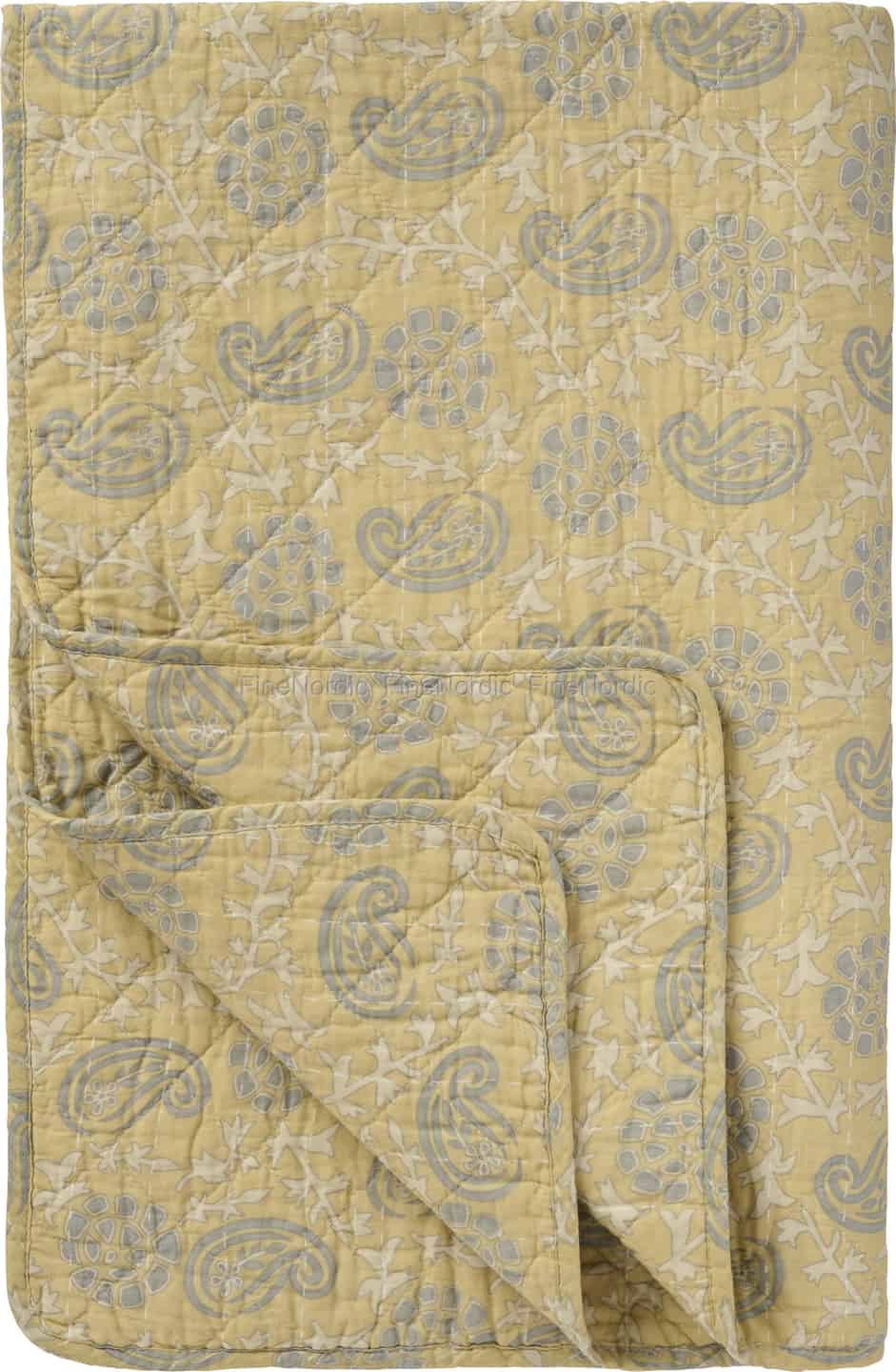 Denne vakre quilten fra Ib Laursen fanger essensen av en fredfull ettermiddag i en solfylt hage. Den duse gulfargen minner om blekt sollys, mens det intrikate mønsteret av paisley-virvler og blomstermotiver i beroligende grått og off-white forteller en historie om tidløst design. Det er mer enn bare et pledd; det er en invitasjon til å ta en pause, helle i en kopp te og nyte et øyeblikk av ren hygge, inntullet i dens myke omfavnelse.