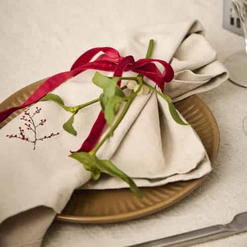 Ib Laursen stofserviett Tradition med julepynt på grankvist linfarget, finn produktet her hos FineNordic.