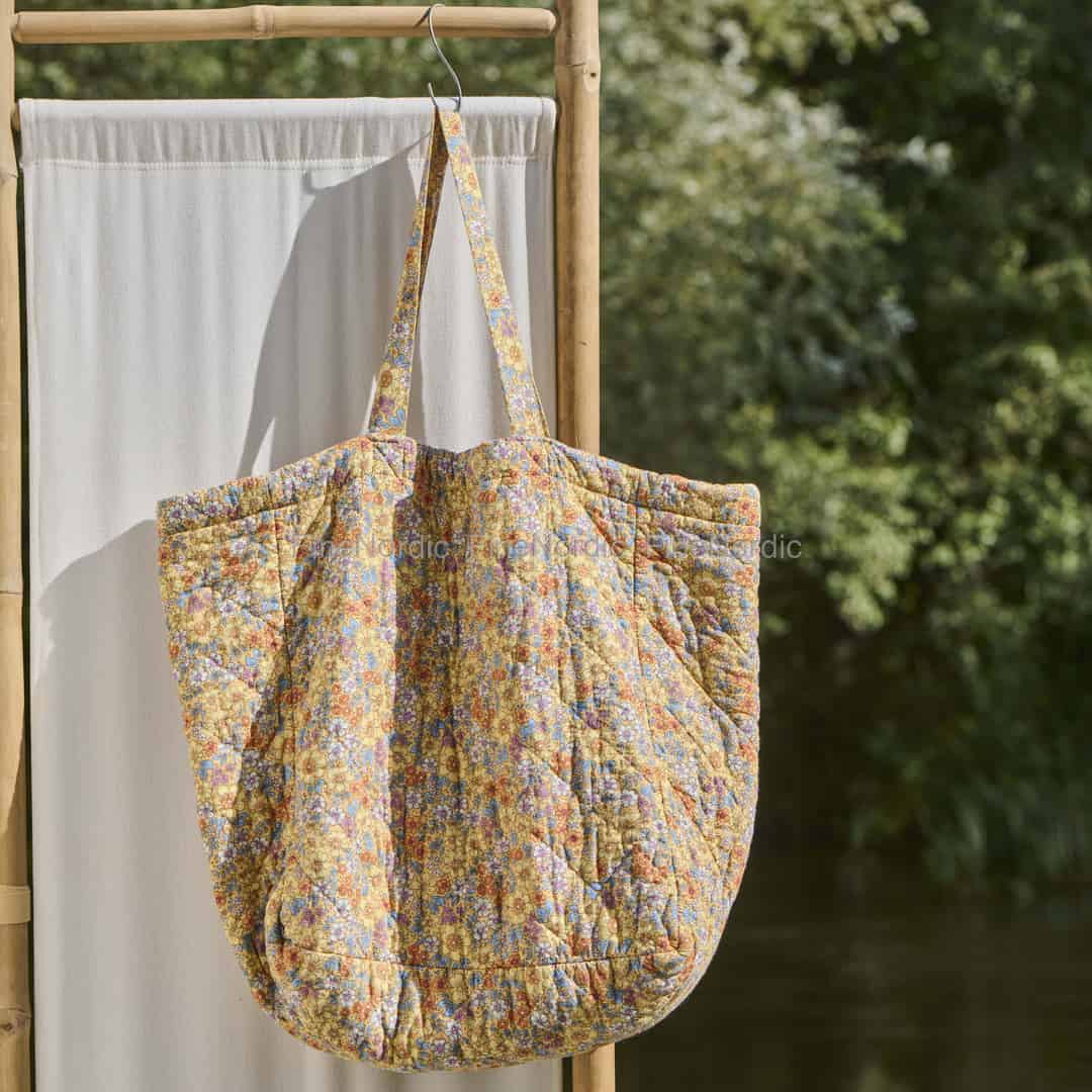 Omfavn de enkle gledene ved en dansk sommer med denne fortryllende vesken fra Ib Laursen. Den solgule bomullen er prydet med en herlig eng av små blomster i myke blåtoner, varme oransjetoner og milde lillatoner, som vekker følelsen av en perfekt ettermiddag utendørs. Den tradisjonelle vatteringen gir en vakker tekstur og en behagelig mykhet, noe som gjør den til mer enn bare en veske – den er en følgesvenn som bringer litt varme og glede til dagen din.