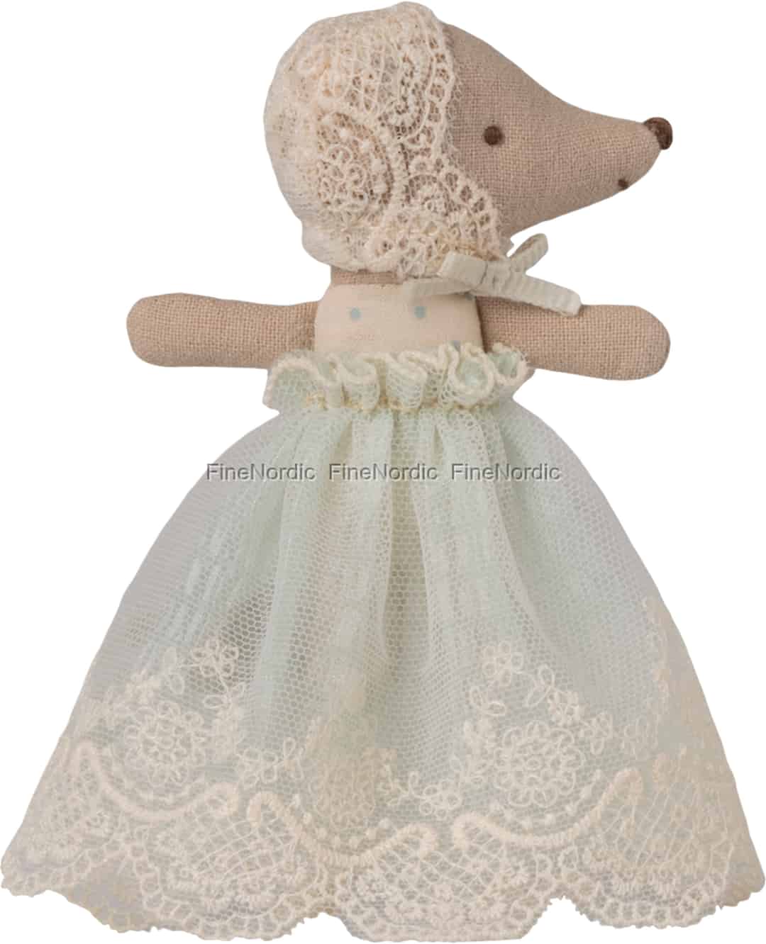 Se for deg en bitteliten mus som våkner med morgensolen, med små, klare øyne klare for en dag full av eventyr. Kledd i en nydelig mintfarget kjole med prikkete liv og en krage med rysjer, er hun alltid klar for et teselskap eller en rolig fortelling i en koselig krok. Hennes intrikate blondekyse, knyttet med et mykt bånd, tilfører et snev av vintage-sjarm som føles tidløs, som om hun har trådt rett ut av et klassisk eventyr.