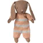 I Mailegs magiske verden har selv de minste vennene de største hjertene. Denne søte, brune kaninen, kledd i en myk, stripete drakt i støvet rosa og lyseblått, er klar til å bli en kjær karakter i barnets fantasifulle fortellinger. Det milde uttrykket og de myke ørene inviterer til stille samtaler og delte hemmeligheter, noe som gjør den til en fantastisk første følgesvenn for små historiefortellere. Fra morgenkos til ettermiddagseventyr i dukkehuset er denne kaninen en trofast og trøstende venn.