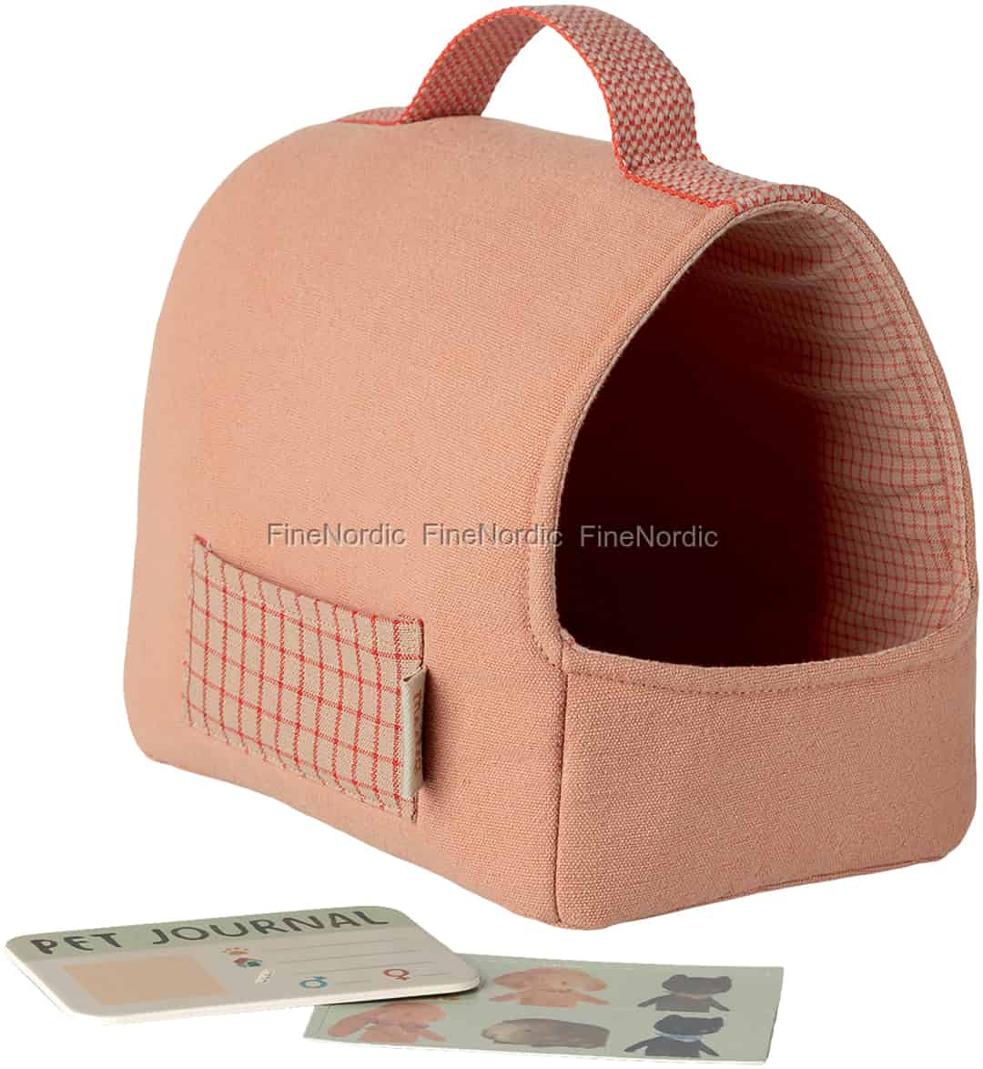 Med denne sjarmerende kjæledyrvesken kan den lille bli den mest fantastiske omsorgspersonen for sitt favorittkosedyr. Det myke korallstoffet og det klassiske, rutete fôret skaper et helt spesielt reisehjem som lover komfort og stil for enhver liten dyrevenn. Det er en gjenstand som inviterer til mild og omsorgsfull lek, og som forvandler en enkel tur fra soverommet til kjøkkenet til et storslått eventyr.