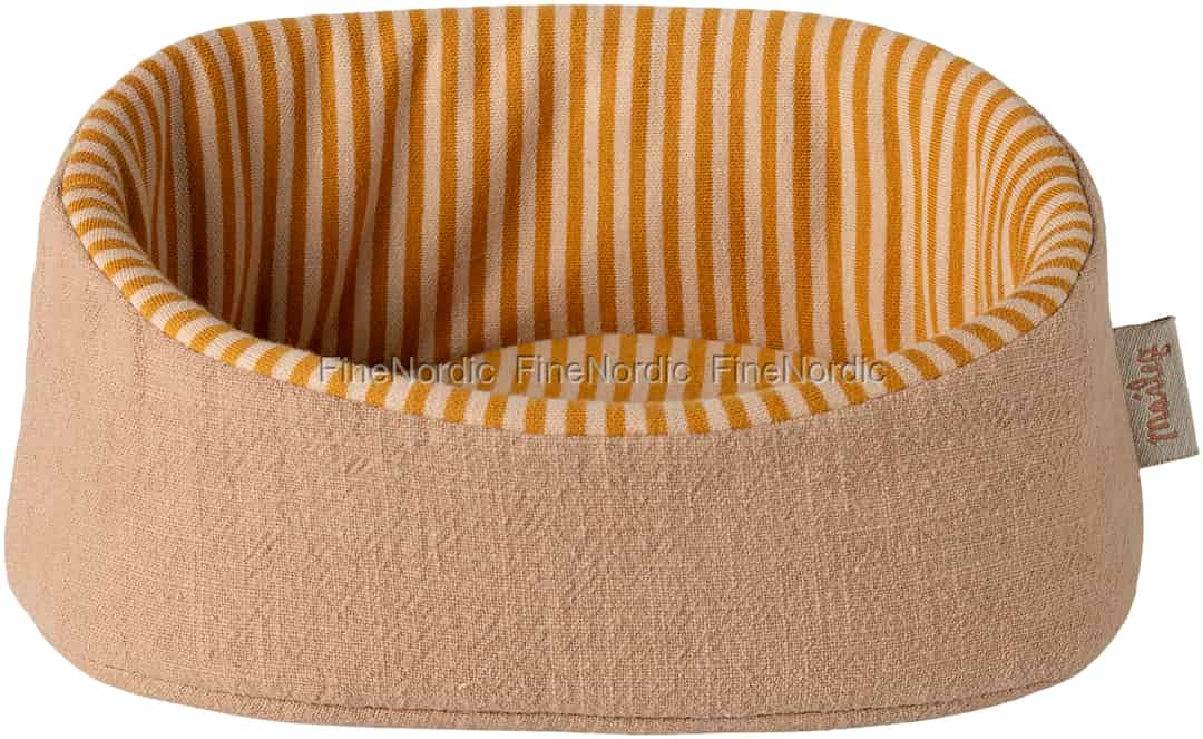 Kurven er laget med den karakteristiske sjarmen Maileg er kjent for, og det robuste, pudderbeige ytre har en herlig, taktil følelse. På innsiden skaper det varme, sennepsstripete fôret en munter og innbydende plass. Den ikoniske Maileg-merkelappen på siden er et stille løfte om kvalitet og autentisk design, som sikrer at denne lille sengen vil være et bakteppe for utallige glade minner i årene som kommer.