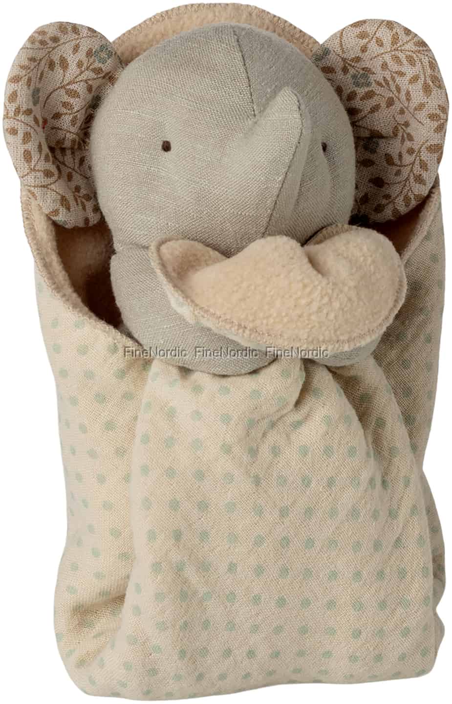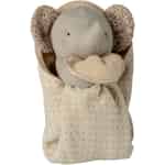 I den magiske verdenen til Maileg har selv de minste vennene de største hjertene. Denne vuggesang-elefanten er tenkt som en første fortrolig venn, en vokter av små hemmeligheter som hviskes rett før søvnen kommer. Den myke, grå tekstilkroppen er vidunderlig trøstende å ta på, mens de store ørene, fôret med et delikat blomstertrykk, alltid er klare til å lytte. Tullet inn i sin egen lune, prikkete teppepose, gir den en herlig følelse av trygghet og selskap for babyen din.