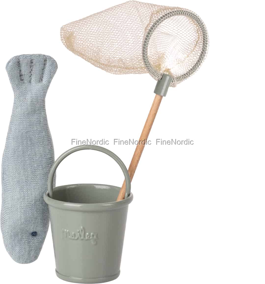 En stille morgen gryr i Mailegs verden, og et eventyr ved elvebredden venter. Med dette vakkert utformede fiskesettet er din lille venn helt klar. Den solide metallbøtten, med sin søte, pregede logo, er klar til å fylles, og den lille håven med sitt glatte trehåndtak føles helt riktig i potene. Det er en scene som tatt rett ut av en eventyrbok, der de enkleste øyeblikkene skaper de kjæreste minnene og fortellingene om vennskap.
