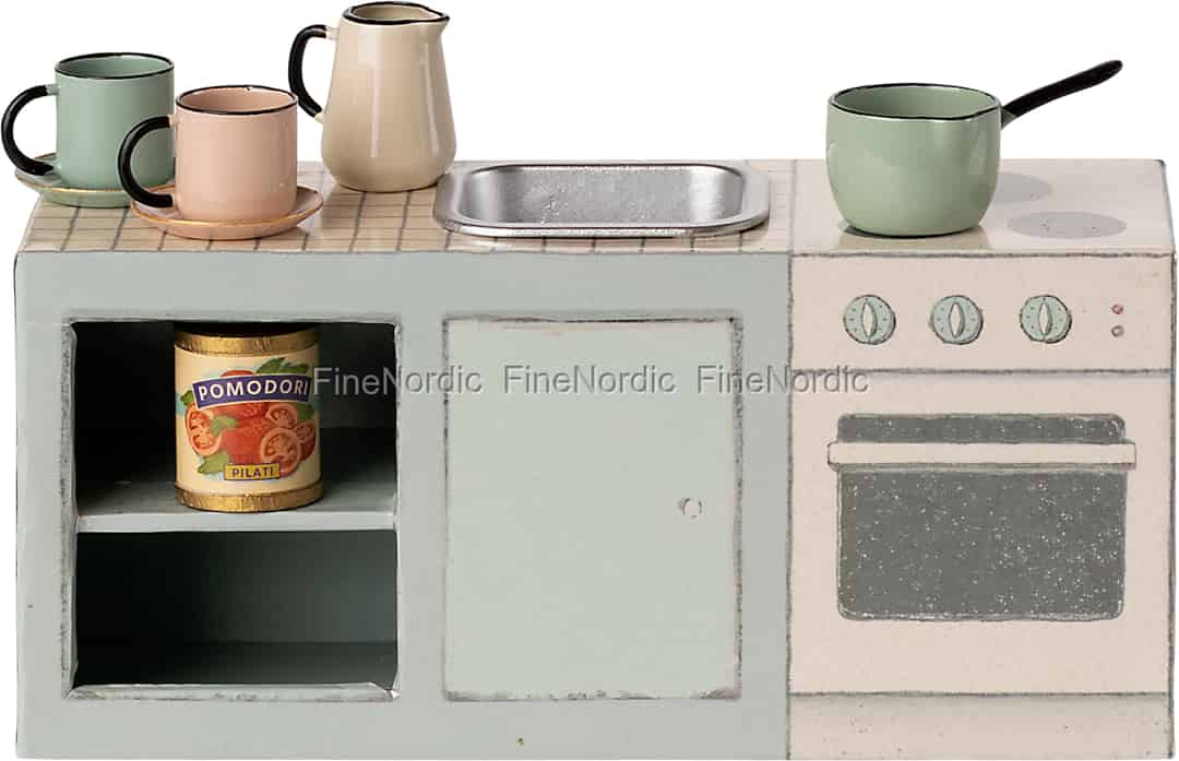 Dette kjøkkenet er ikke bare en leke; det er en invitasjon til en verden av fantasi. Det leveres komplett med et nydelig sett tilbehør, inkludert krus, tallerkener og en mugge, klart for en koselig frokost eller en prat over en kopp te. Designet for å passe sømløst inn i Maileg-musehuset, hjelper det deg med å bygge et komplett og fortryllende hjem for dine små venner, der hver dag er fylt med de enkle gledene i et miniatyrliv.