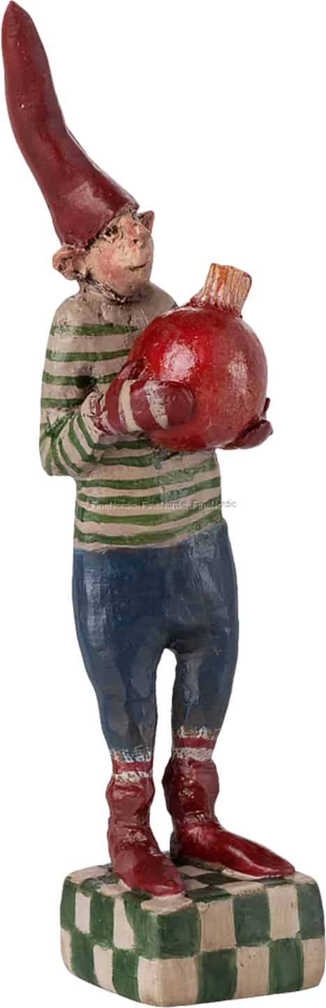 I et stille verksted, hvor duften av gran henger i luften, vekkes Mailegs Noilly Noël-nisser til live. Nummer 32 er en spesielt munter sjel, kledd i sin stripete favorittgenser og klar for høytiden. Han holder varsomt en skinnende rød julekule, et symbol på varmen og lyset han bringer til hjemmet. Hans rustikke, håndmalte overflate forteller en historie om kunstnerisk håndverk og omsorg, fra tuppen av den høye, røde nisseluen til det solide, rutete stativet. Hvert penselstrøk fanger en følelse av tidløs folklore og inviterer deg til å senke skuldrene og nyte den enkle magien i sesongen.