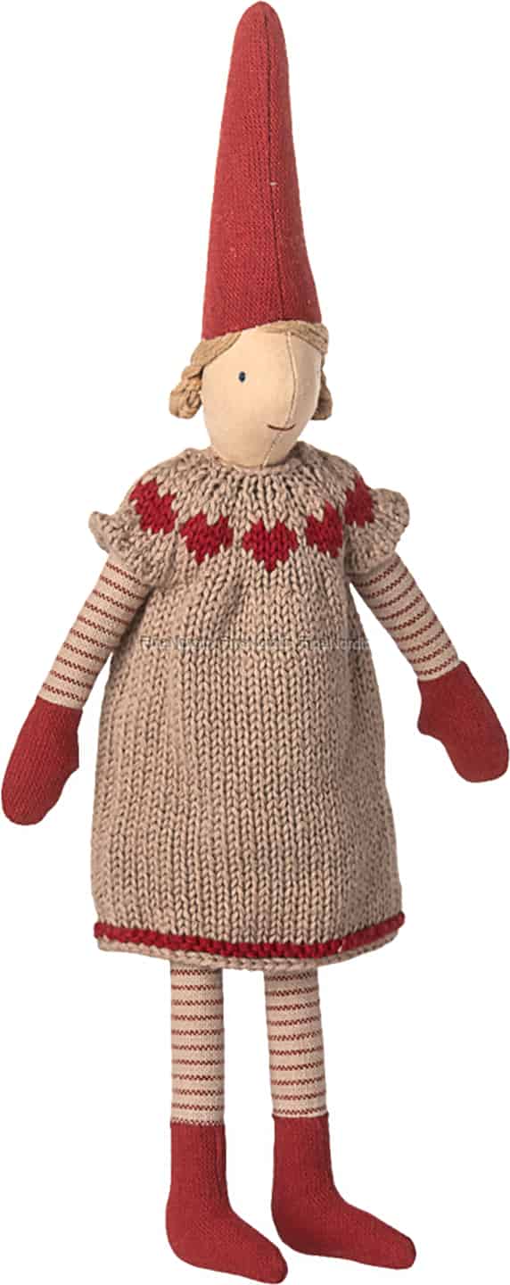 Se for deg den stille forventningen på julemorgenen, fanget i denne fortryllende Maileg-nissen. Kledd i sin koseligste strikkekjole er hun klar til å dele familiens juletradisjoner og våke over høytidens rolige øyeblikk.