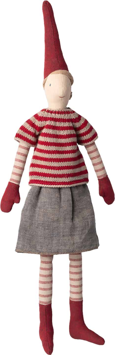 Kledd for en kjølig nordisk vinterdag, er antrekket hennes en fryd av ulike teksturer. Legg merke til den tykke strikken i den stripete genseren, den myke filten i den karakteristiske røde nisseluen og vottene, og den fine vevingen i det grå skjørtet. Hver detalj, fra de stripete strømpene til de små, røde støvlene, er omtenksomt designet for å vekke fantasien. Hun er en karakter som bare venter på å bli vevd inn i teppet av familiens juleminner.